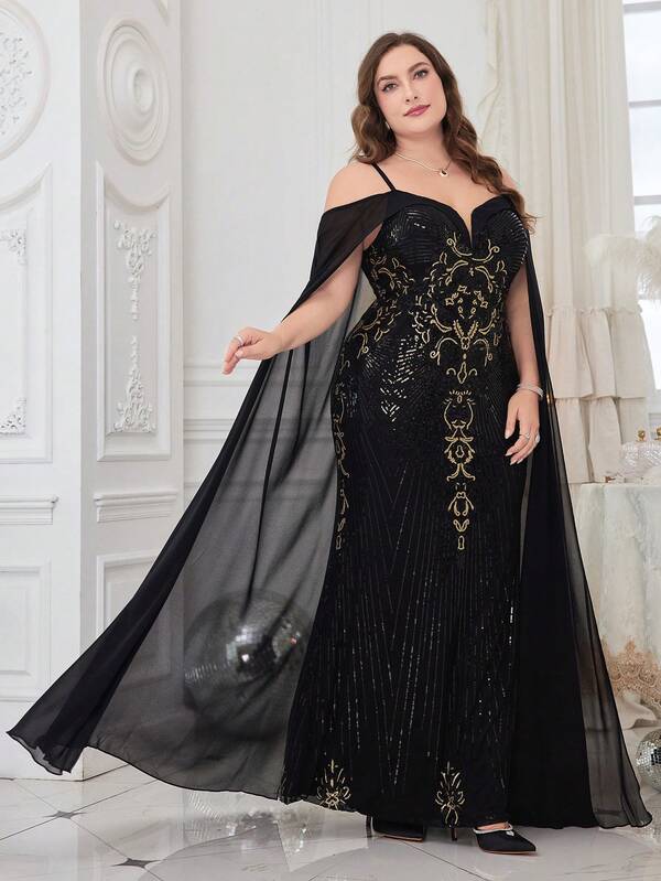Plus Cold Shoulder Cloak Sleeve Sequin Prom Dress With Cape