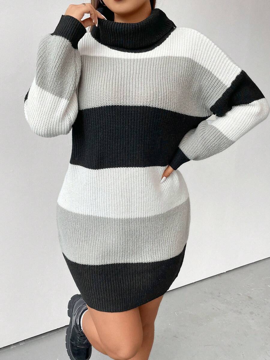 Plus Color Block Turtleneck Drop Shoulder Sweater Dress