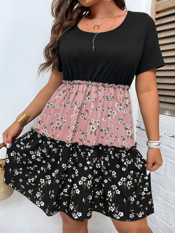 SHEIN Unity Plus Colorblock & Floral Frill Ruffle Hem Dress