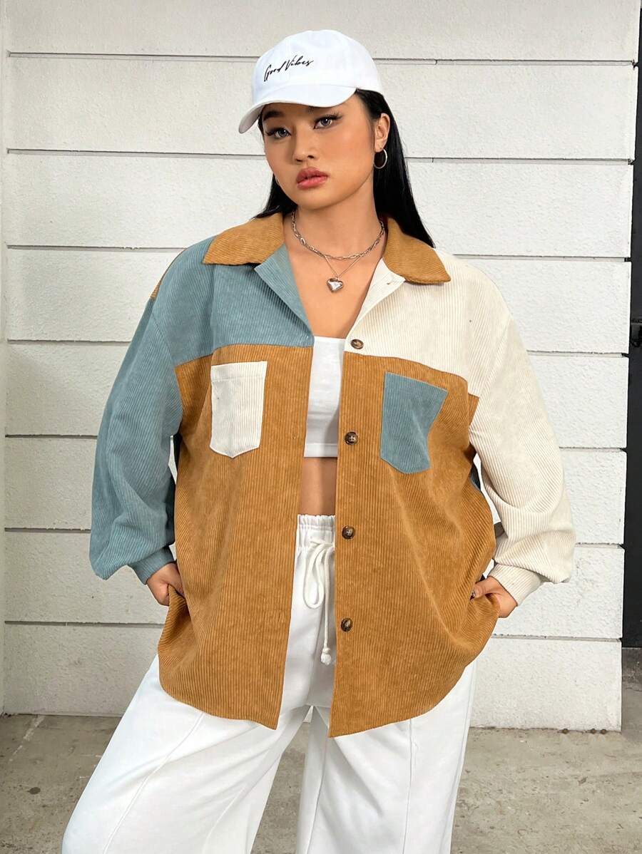 SHEIN EZwear Plus Colorblock Drop Shoulder Corduroy Coat