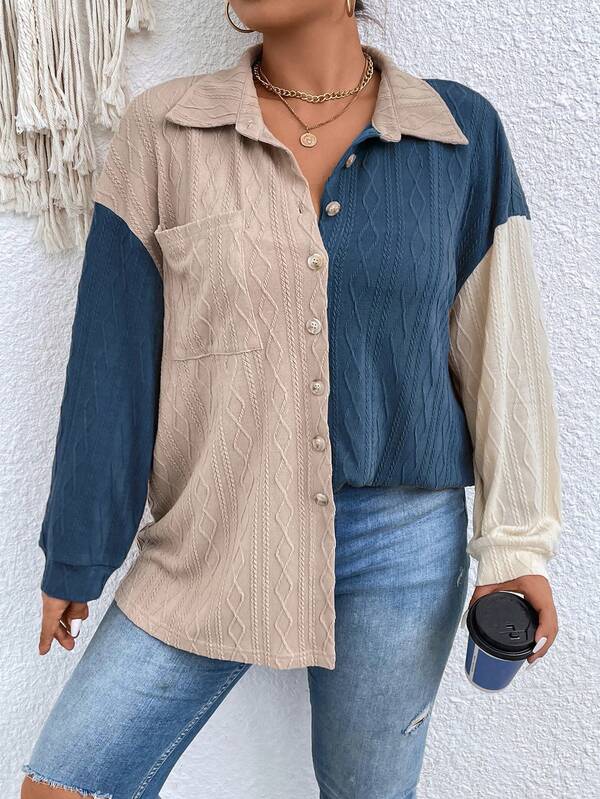 SHEIN Essnce Plus Colorblock Drop Shoulder Pocket Patched Shirt