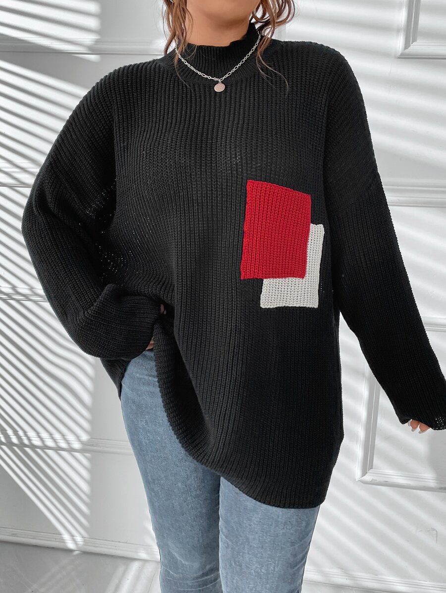 Plus Colorblock Mock Neck Drop Shoulder Sweater