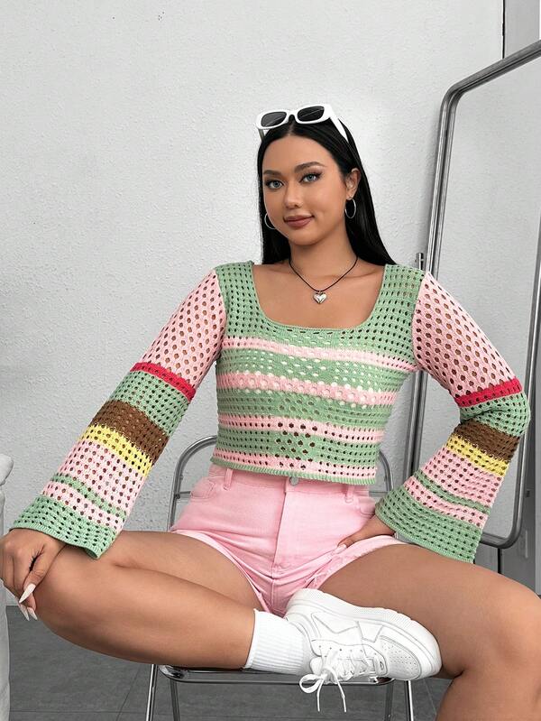SHEIN Qutie Plus Colorblock Square Neck Trumpet Sleeve Sweater