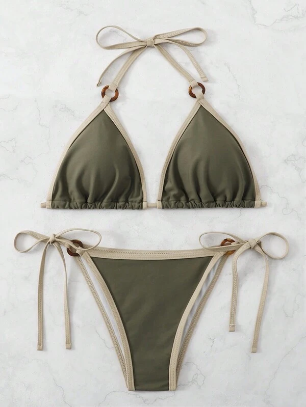 SHEIN Swim Vcay Plus Contrast Binding Halter Triangle Tie Side Bikini Swimsuit