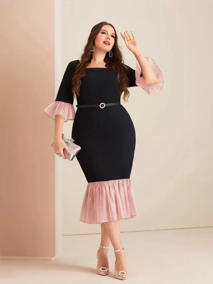 SHEIN Mulvari Plus Contrast Flounce Sleeve Mermaid Hem Dress Without Belt