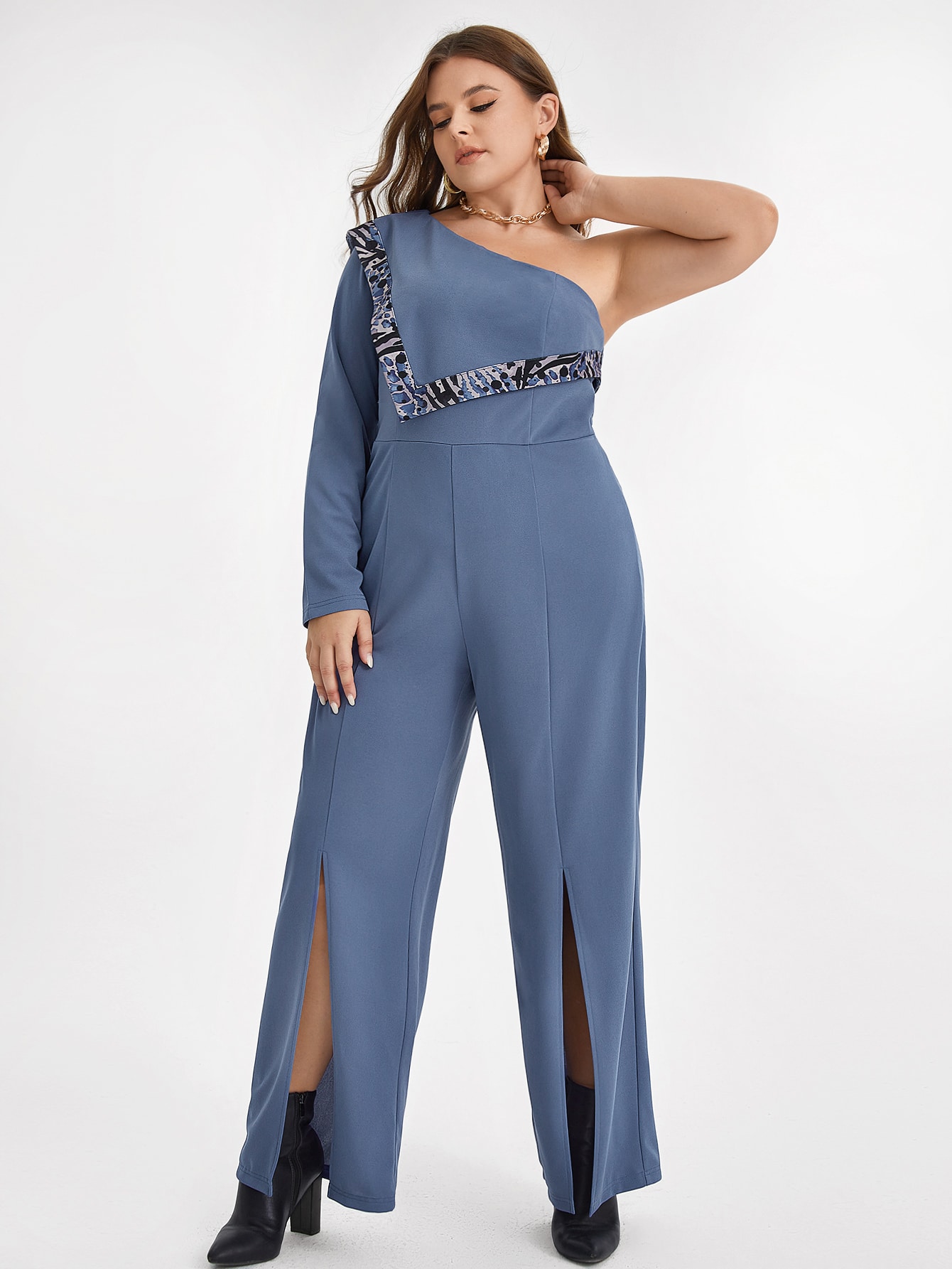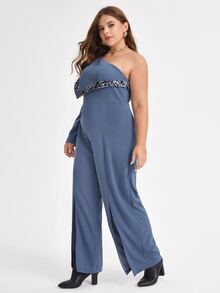 Courageous Creations Plus Contrast Graphic Print One Shoulder Split Hem Jumpsuit