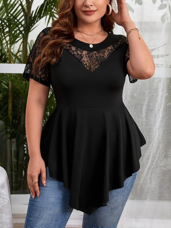 SHEIN Privé Plus Contrast Lace Asymmetrical Hem Tee