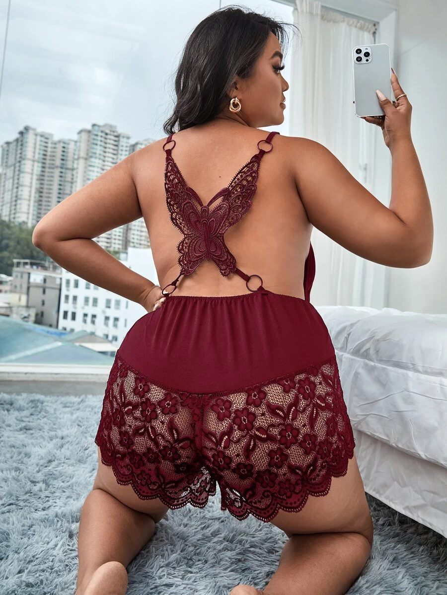 Plus Contrast Lace Backless Ring Linked Sleep Romper