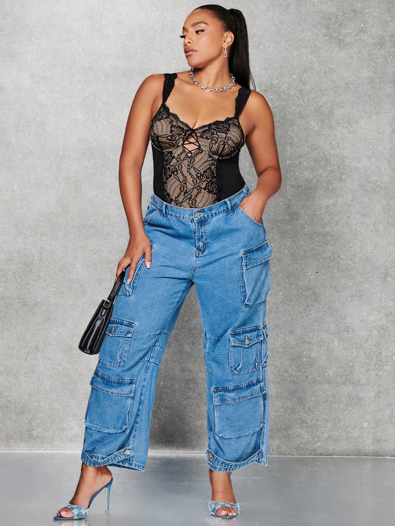 SHEIN BAE Plus Contrast Lace Crisscross Front Bodysuit