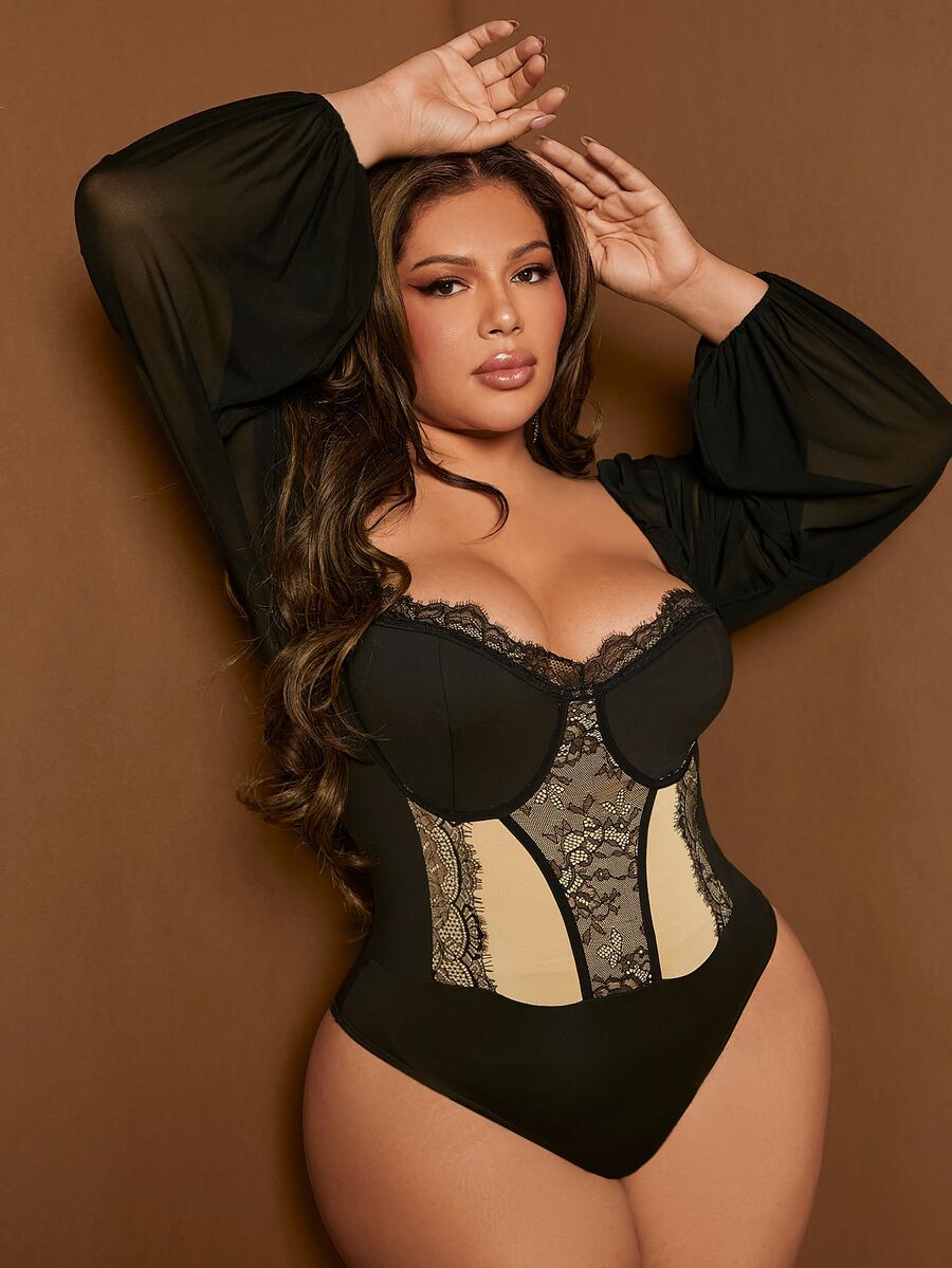 SHEIN SXY Plus Contrast Lace Lantern Sleeve Bodysuit