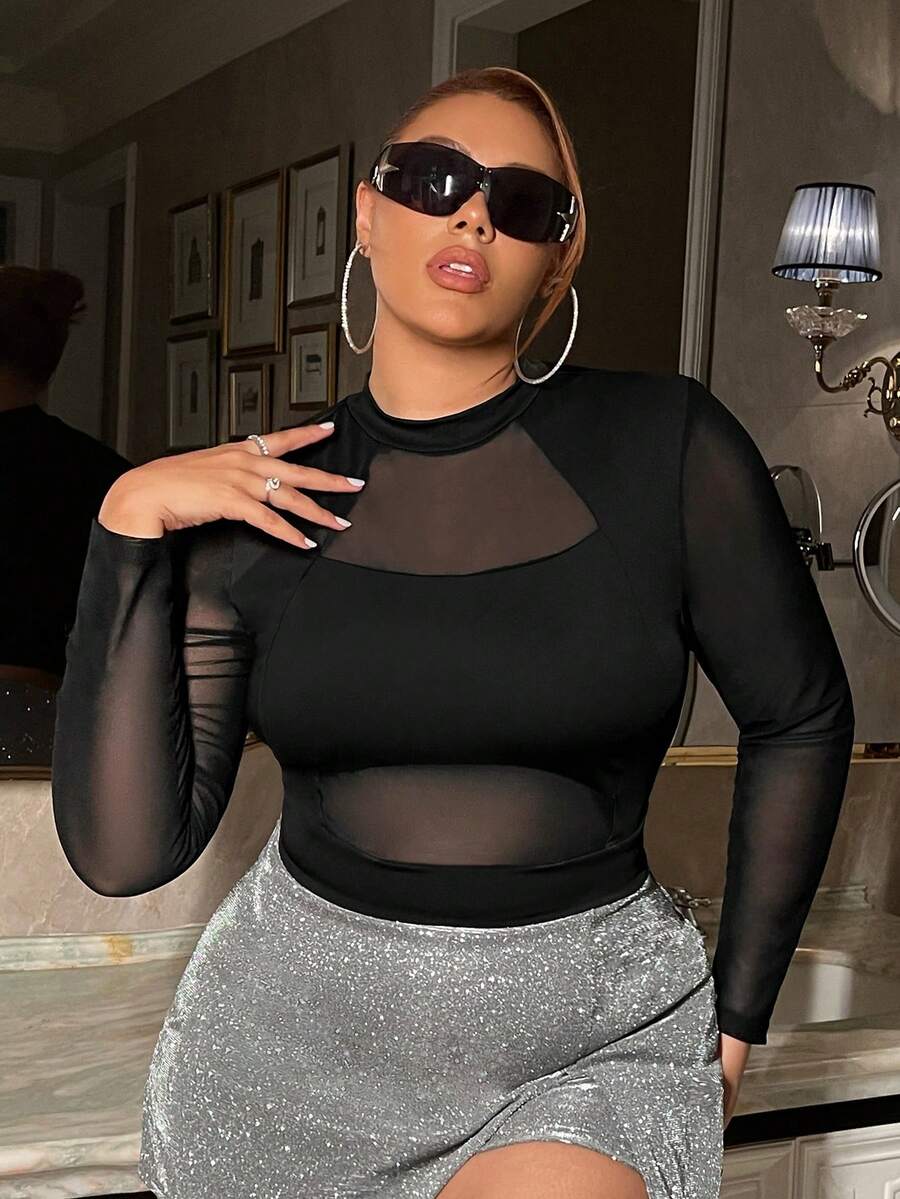 SHEIN ICON Plus Contrast Mesh Mock Neck Tee