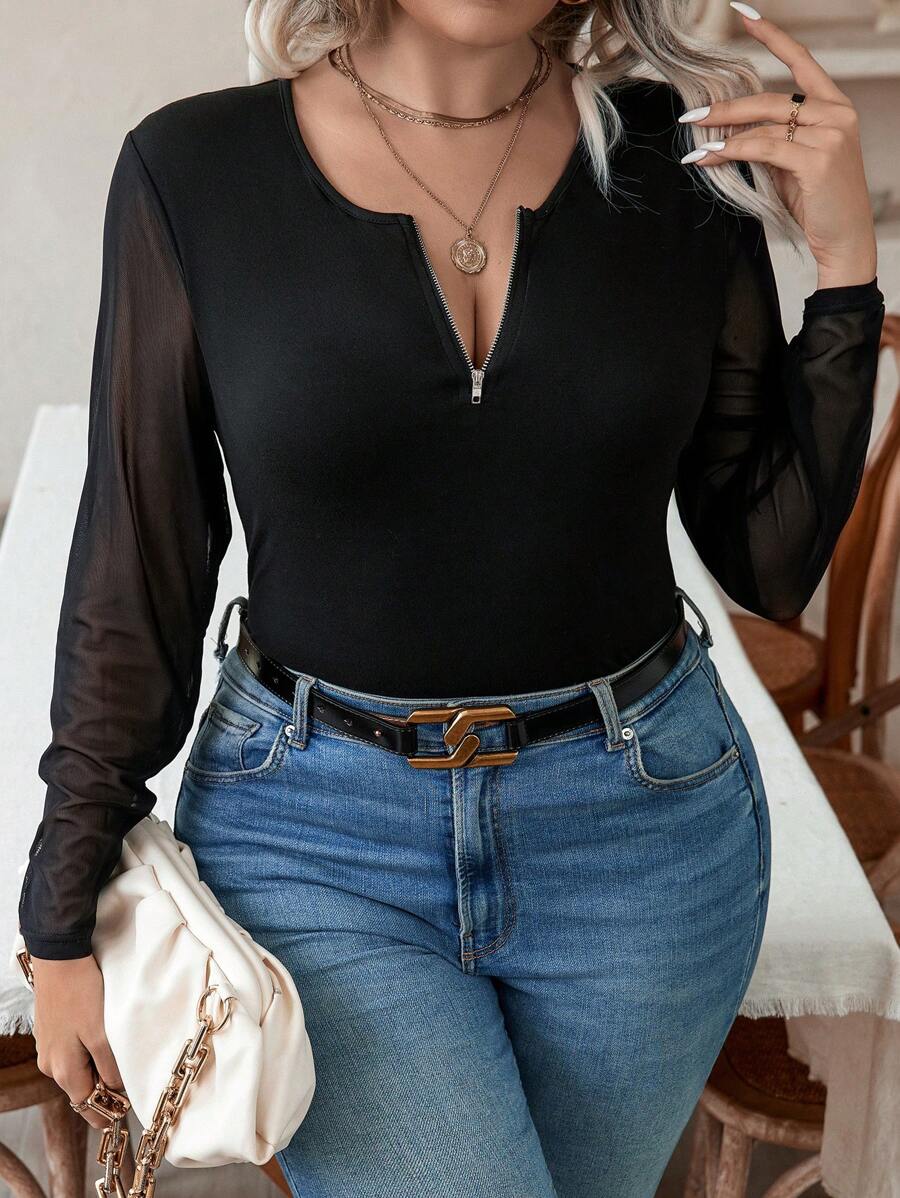 SHEIN Privé Plus Contrast Mesh Sleeve Half Zip Tee