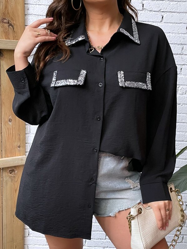 SHEIN LUNE Plus Contrast Sequin Trim Drop Shoulder Shirt