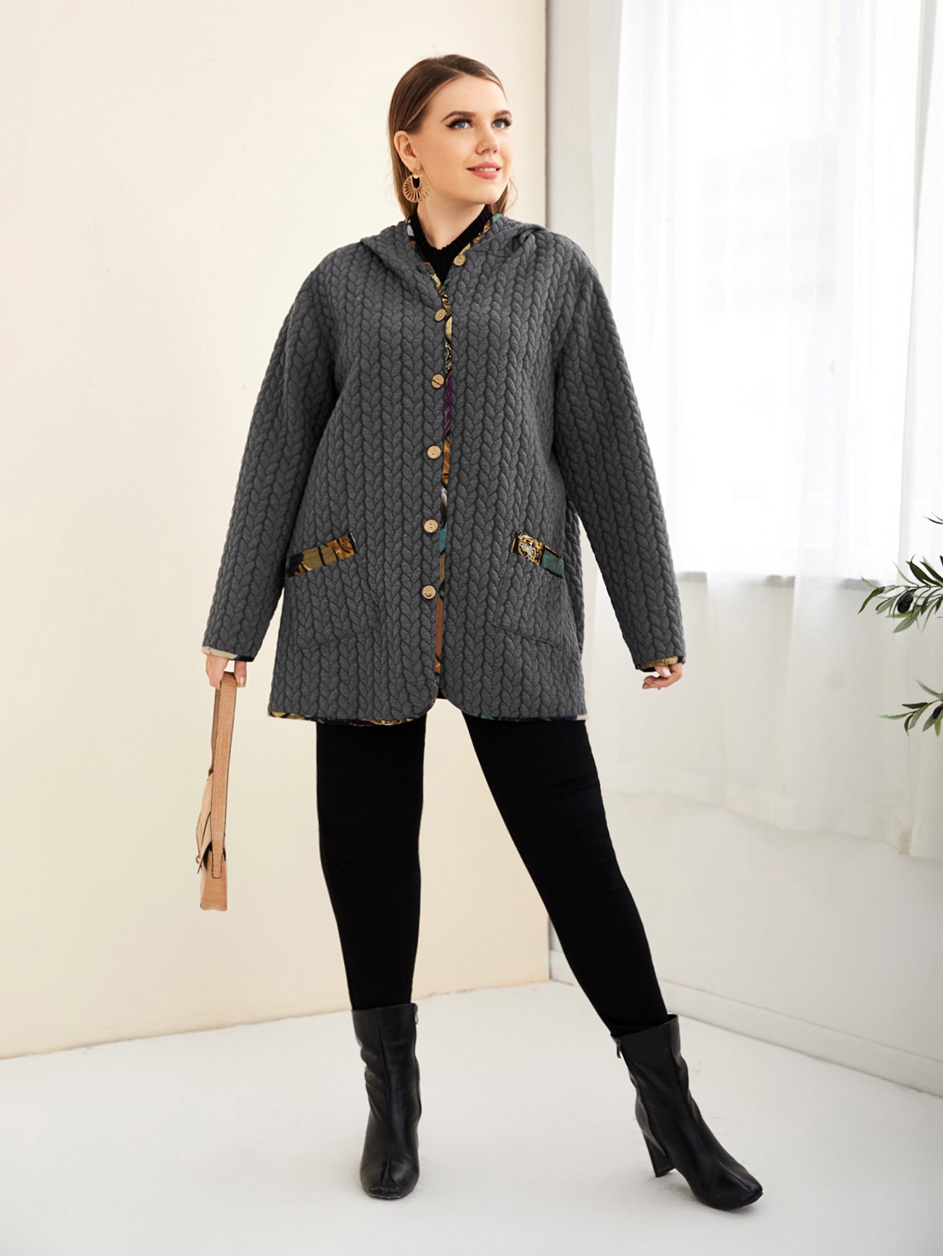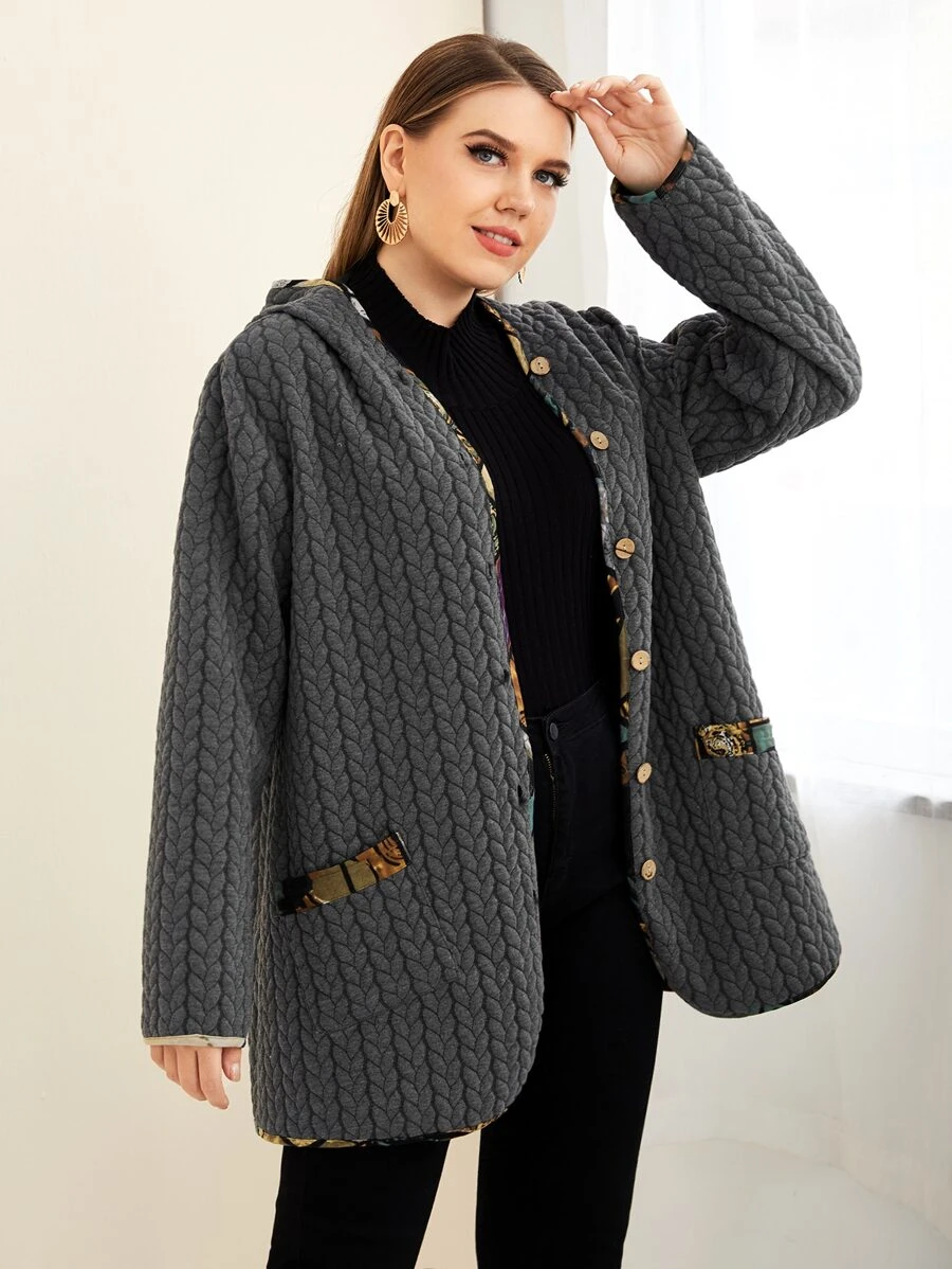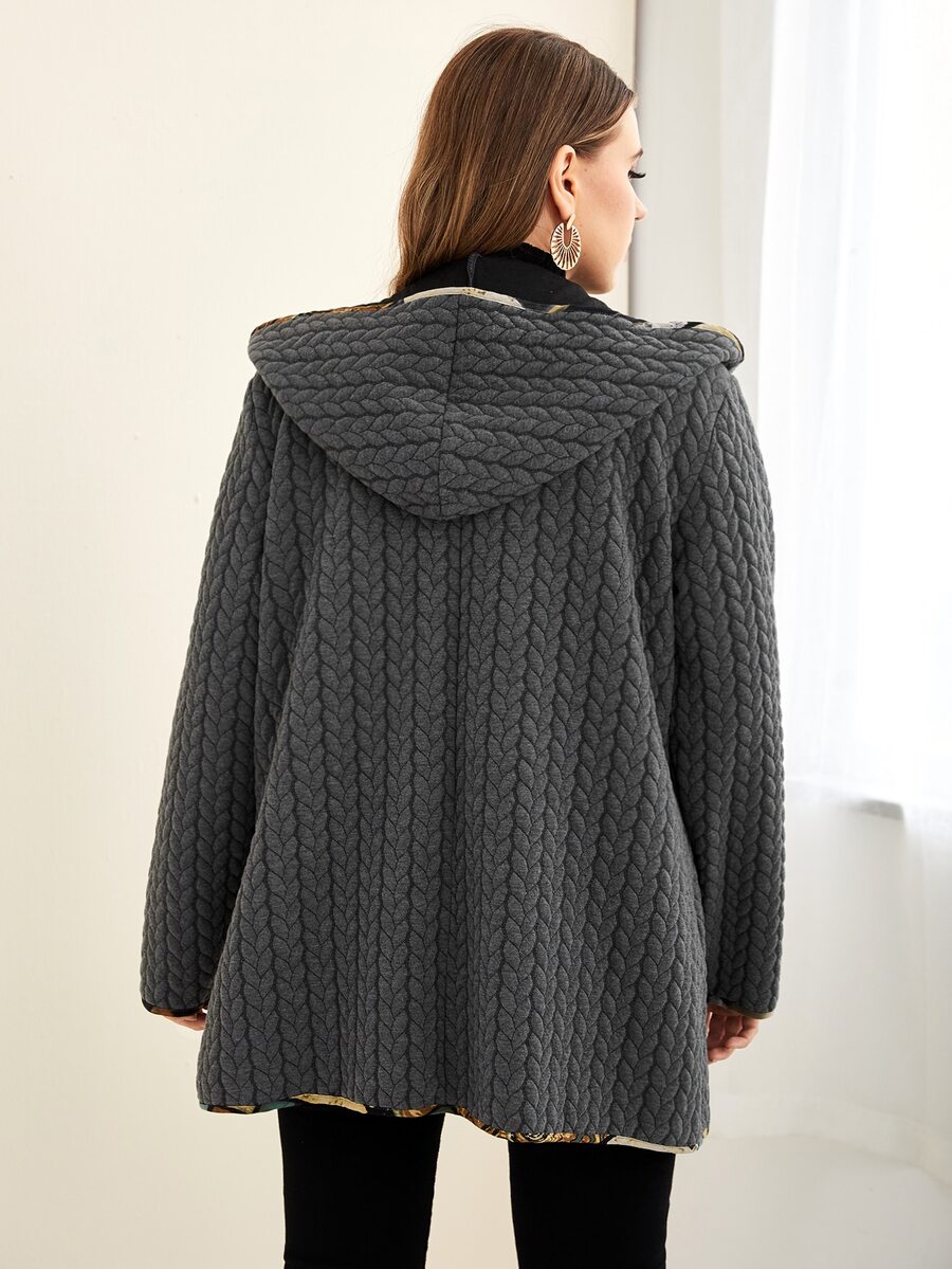 SHEIN Mulvari Plus Contrast Trim Pocket Front Hooded Coat