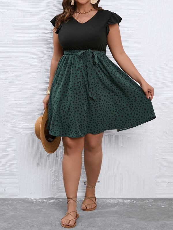 SHEIN LUNE Plus Dalmatian Print Ruffle Trim Belted Dress