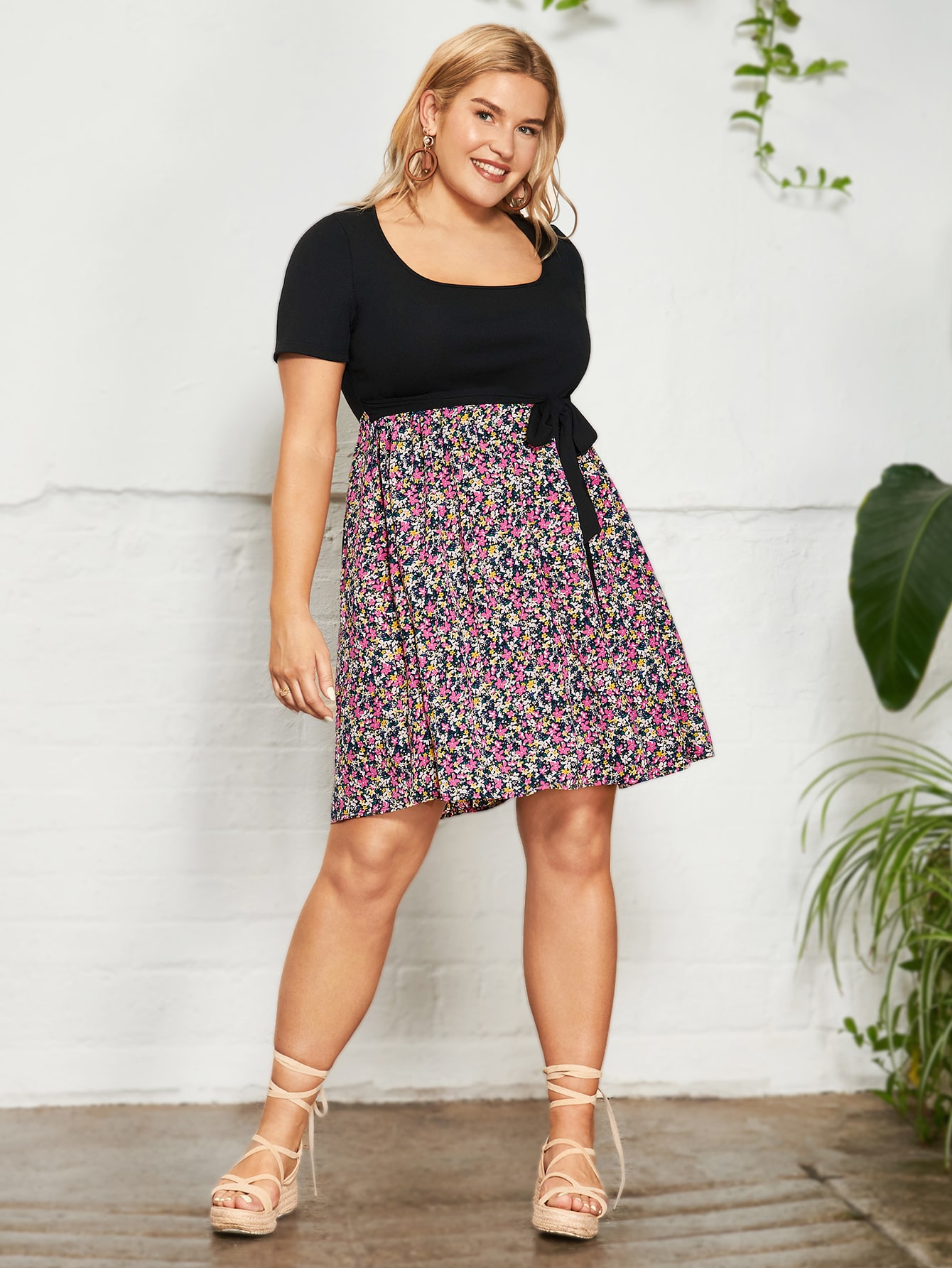 SHEIN VCAY Plus Ditsy Floral Belted A-line Dress