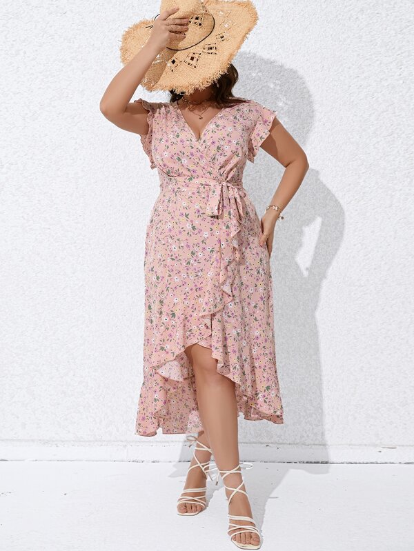 SHEIN VCAY Plus Ditsy Floral Print Butterfly Sleeve Ruffle Trim Wrap Belted Dress
