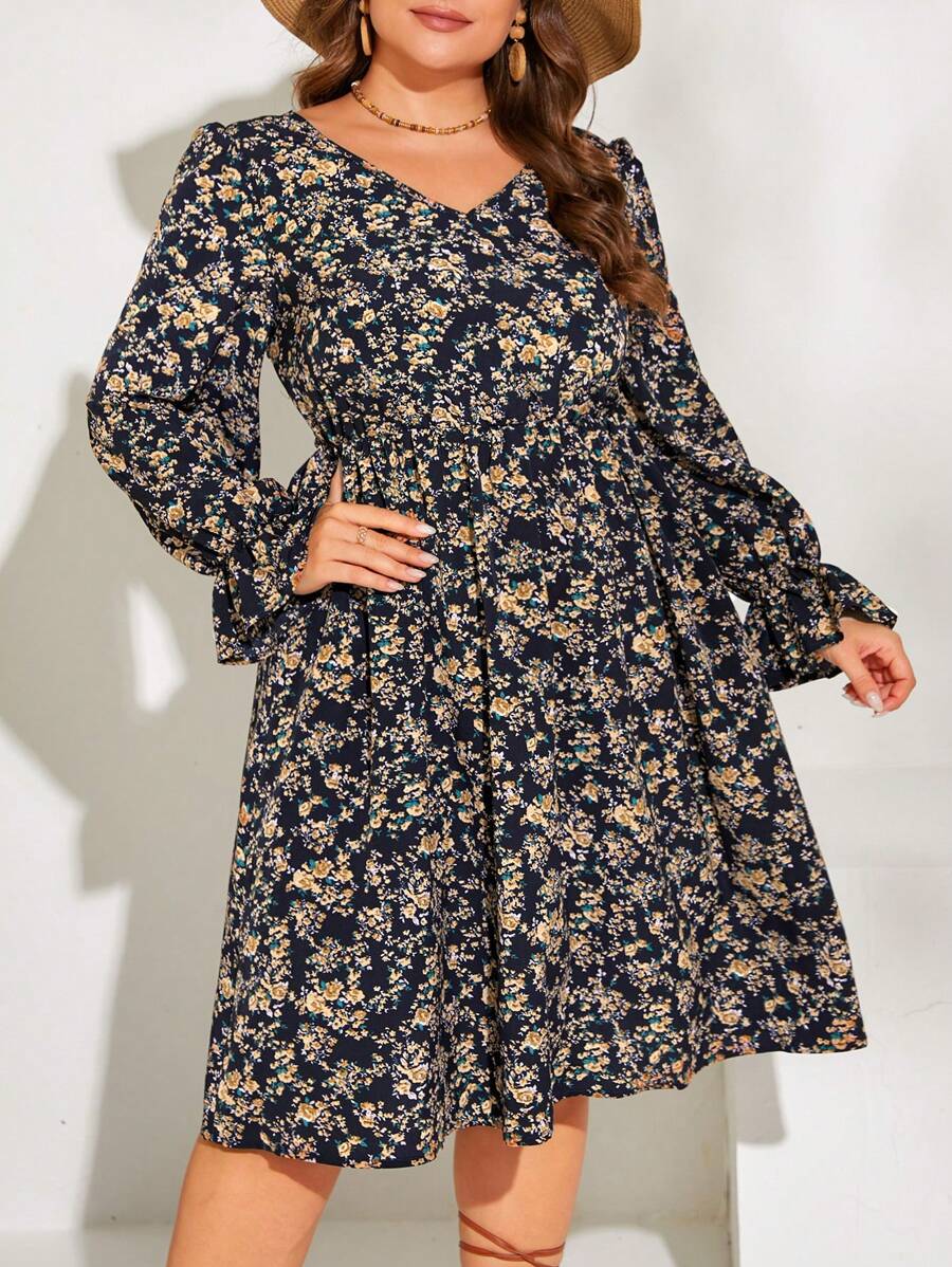 SHEIN VCAY Plus Ditsy Floral Print Lace Trim Flare Sleeve Dress