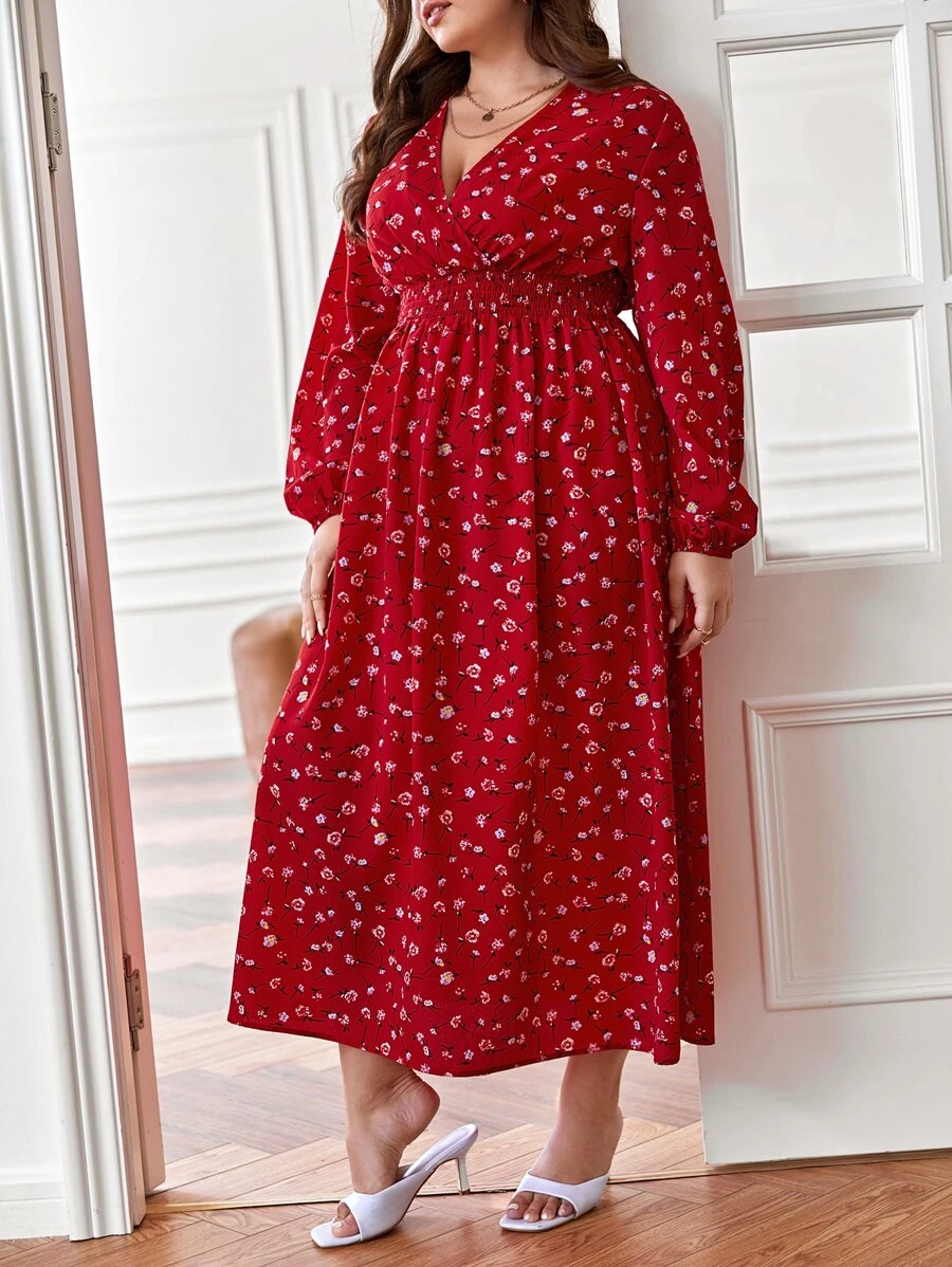 SHEIN Frenchy Plus Ditsy Floral Print Lantern Sleeve Dress