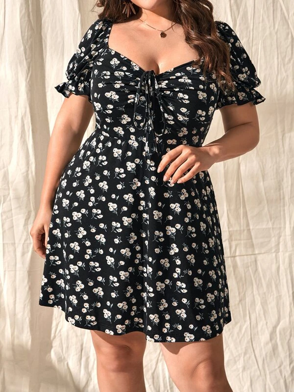 SHEIN VCAY Plus Ditsy Floral Print Ruched Bust Knot Front Puff Sleeve Dress