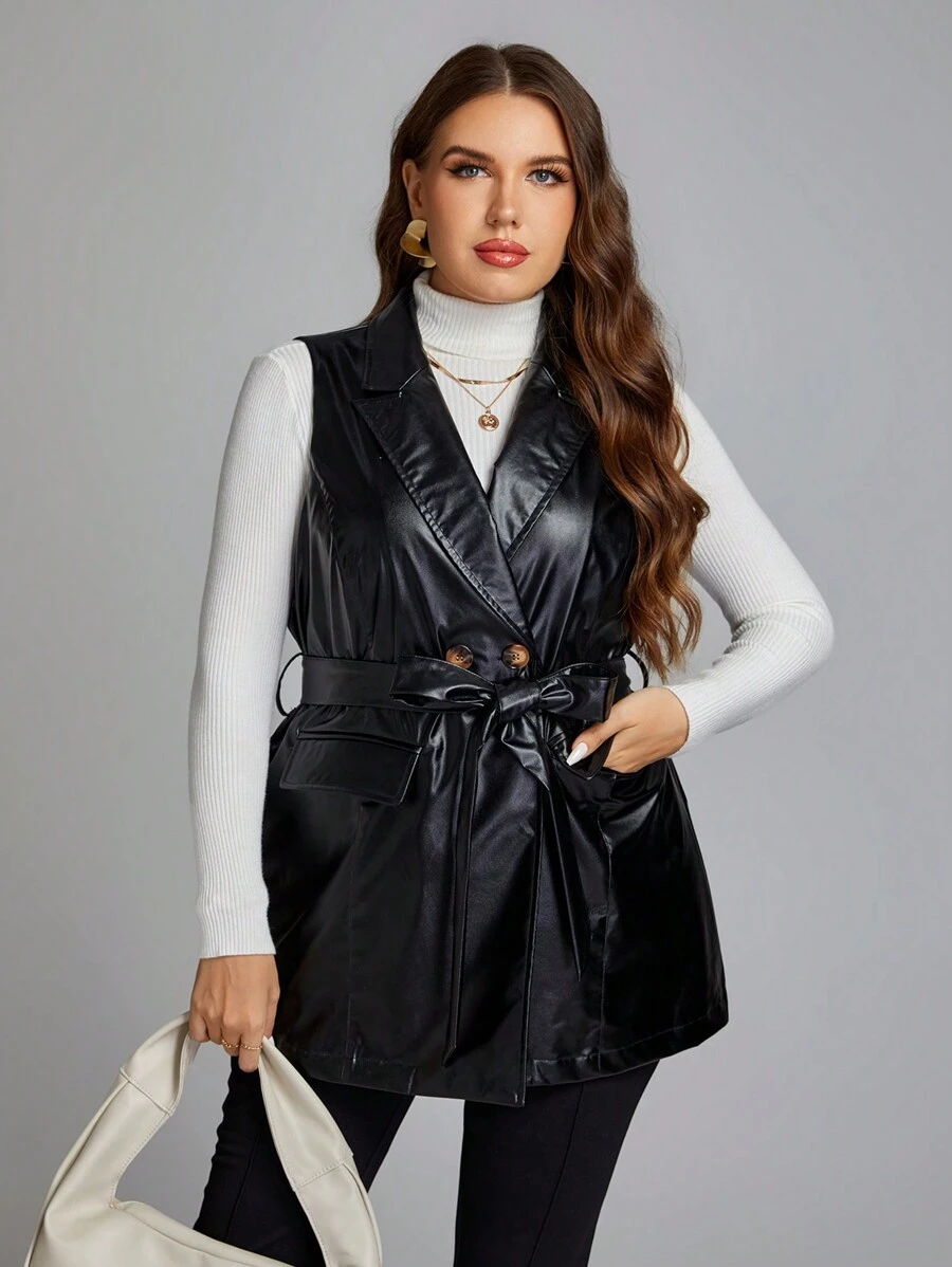 SHEIN Clasi Plus Double Breasted Belted PU Leather Vest Coat