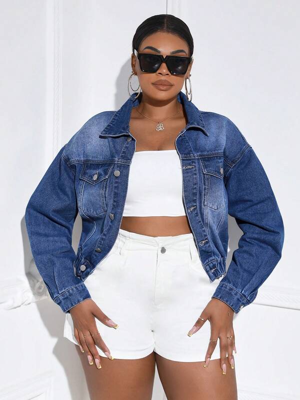 SHEIN SXY Plus Drop Shoulder Flap Pocket Denim Jacket