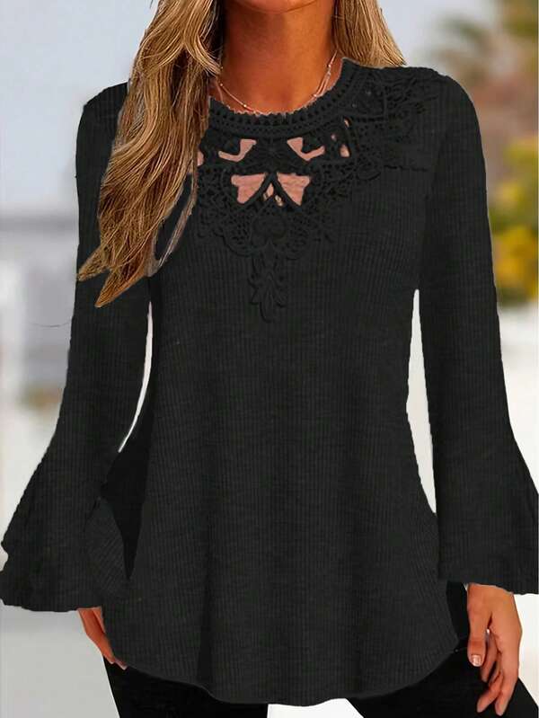 Plus Embroidered Mesh Panel Flare Sleeve Tee