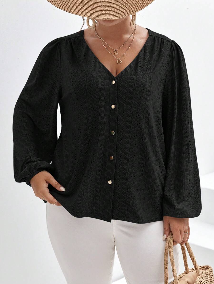 SHEIN Frenchy Plus Eyelet Embroidery Lantern Sleeve Button Front Blouse