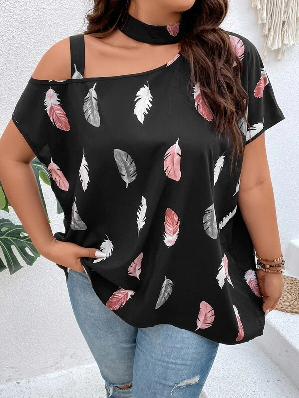 SHEIN LUNE Plus Feather Print Asymmetrical Neck Blouse