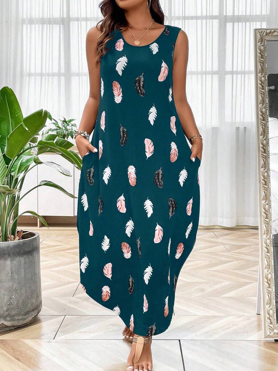SHEIN LUNE Plus Feather Print Hidden Pocket Curved Hem Tank Dress