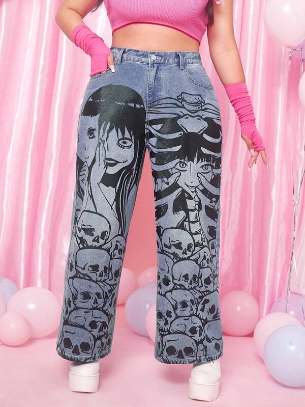 ROMWE Anime Plus Figure Skull Graphic Straight Leg Jeans