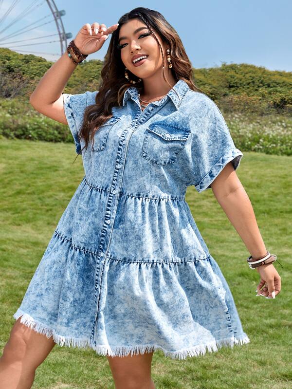 SHEIN WYWH Plus Flap Pocket Batwing Sleeve Ruffle Hem Denim Dress