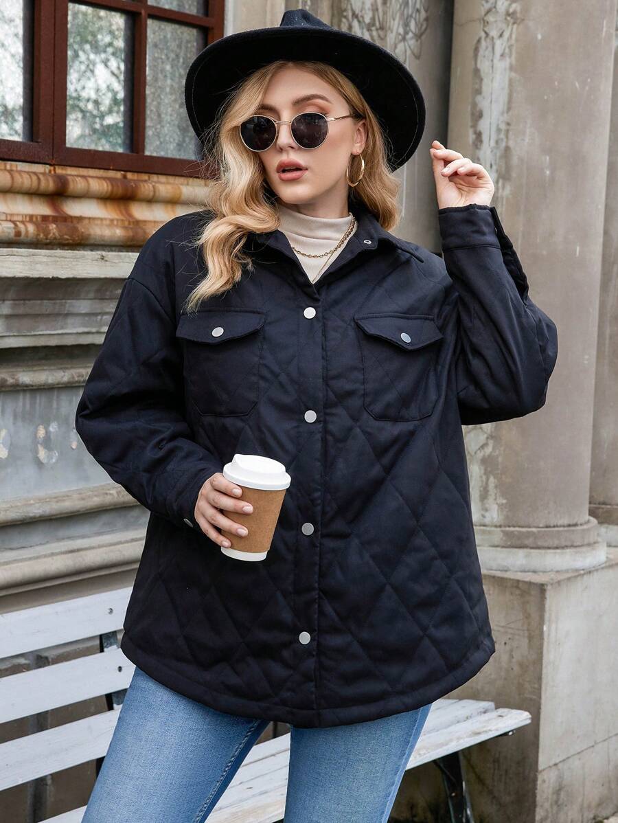 SHEIN Essnce Plus Flap Pocket Drop Shoulder Quilted Coat