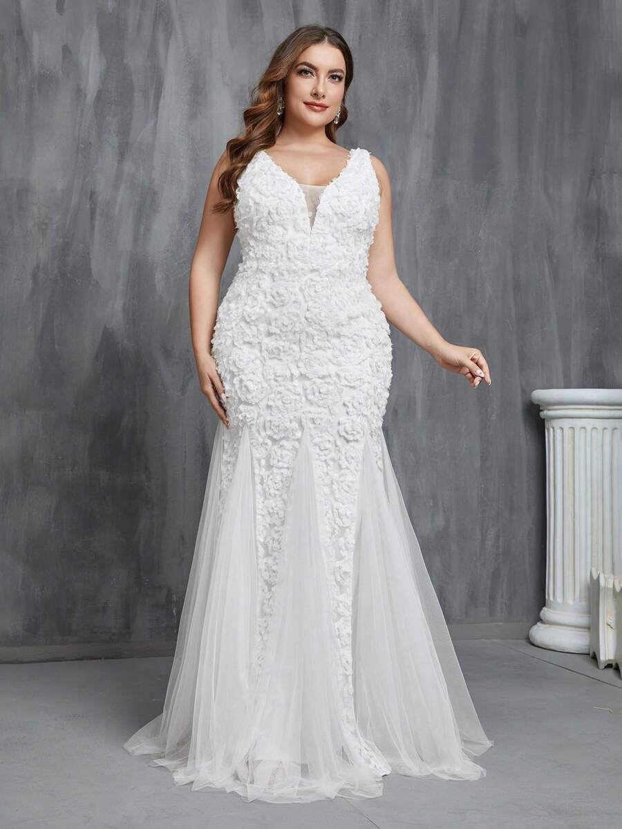 Plus Floral Appliques Detail Mesh Formal Dress