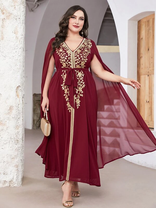 SHEIN Najma Plus Floral Embroidery Mesh Overlay Belted Dress