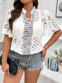 SHEIN LUNE Plus Floral Embroidery Notched Neckline Butterfly Sleeve Schiffy Blouse