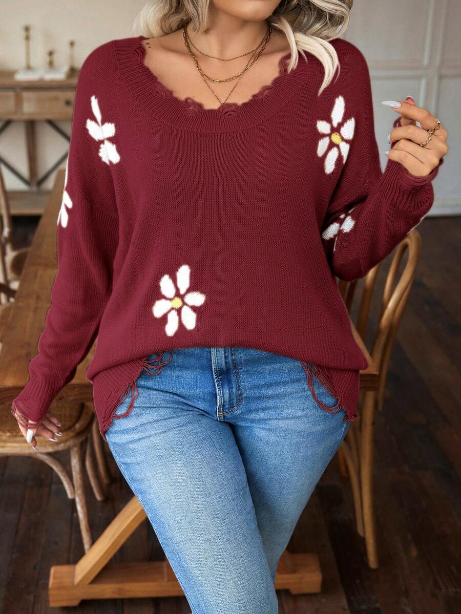 SHEIN Essnce Plus Floral Pattern Drop Shoulder Distressed Sweater