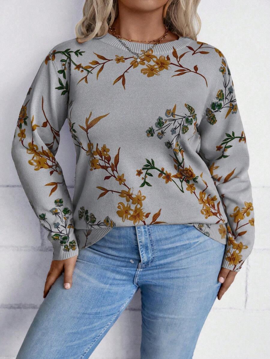 SHEIN LUNE Plus Floral Pattern Drop Shoulder Sweater