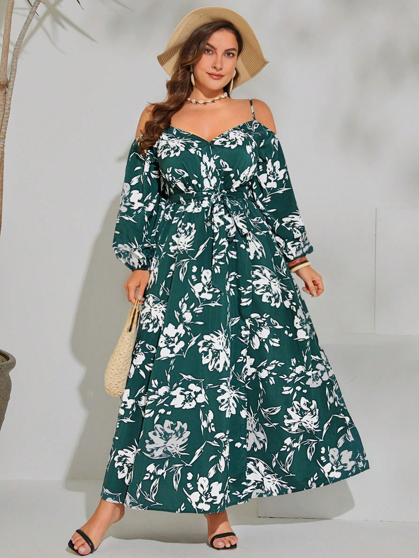 SHEIN VCAY Plus Floral Print Cold Shoulder Belted Dress