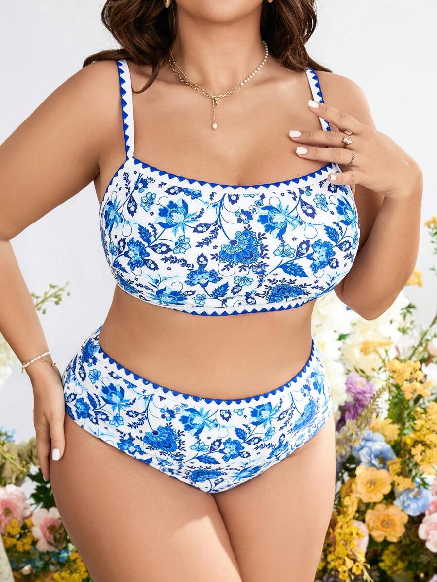 SHEIN Swim BohoFeel Plus Floral Print Contrast Binding Bikini Swimsuit