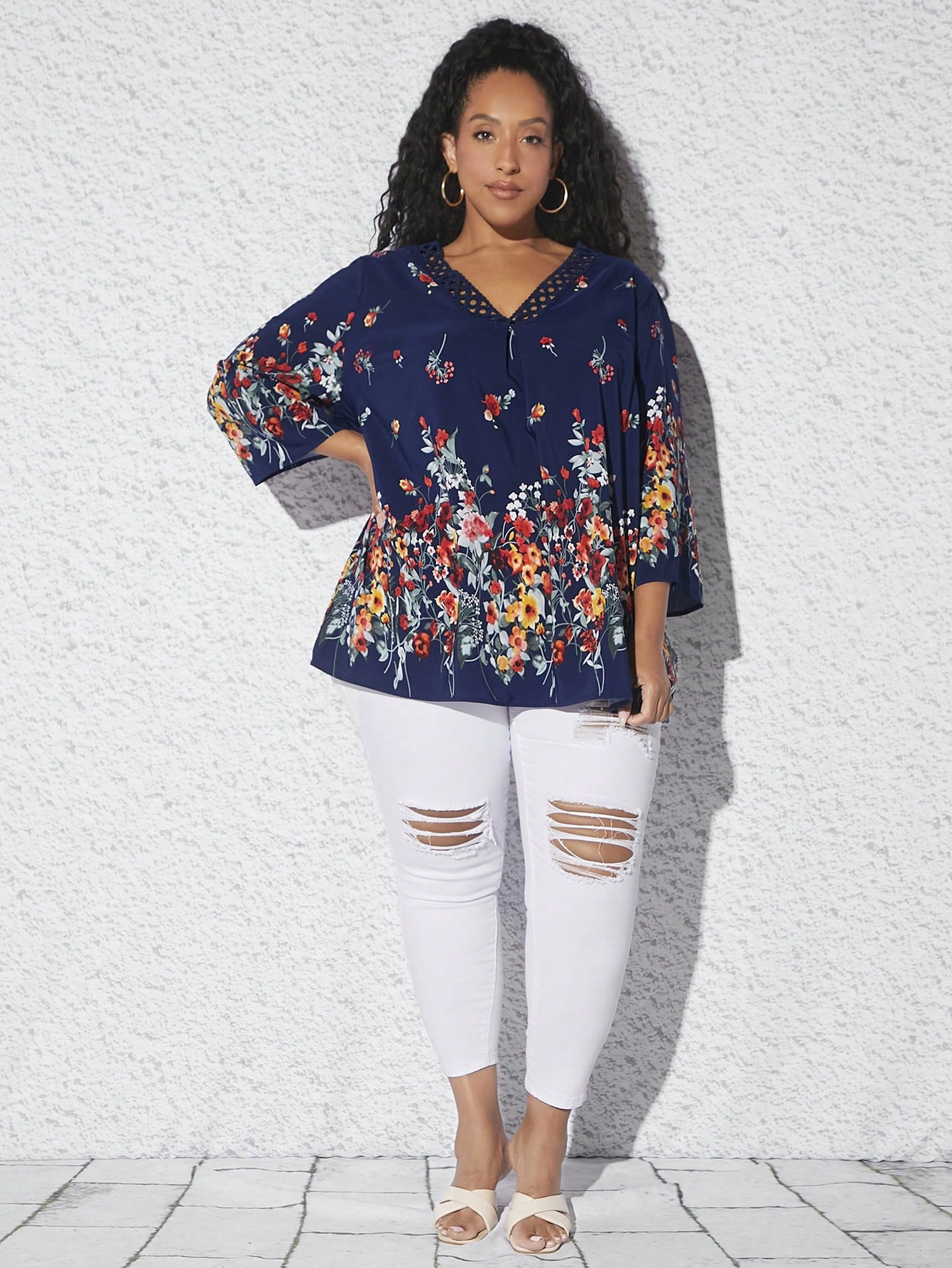 SHEIN CURVE+ Plus Floral Print Guipure Lace Trim Blouse
