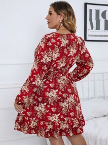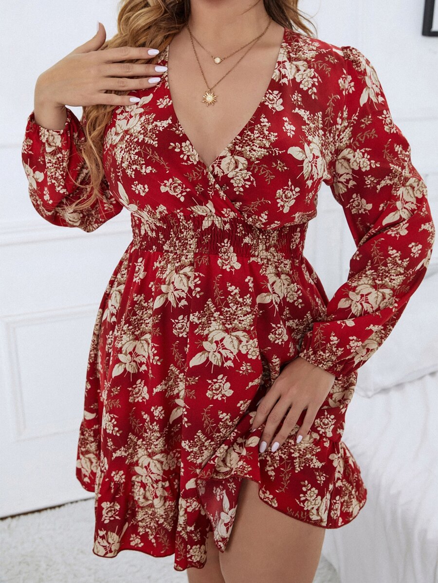 Plus Floral Print Lantern Sleeve Shirred Waist Dress