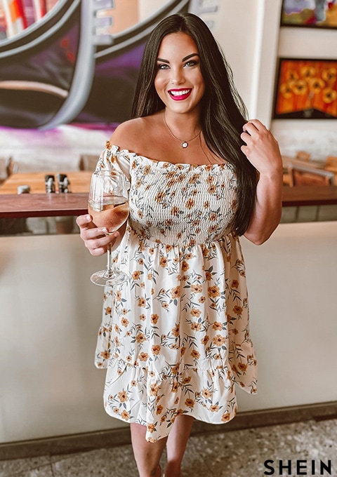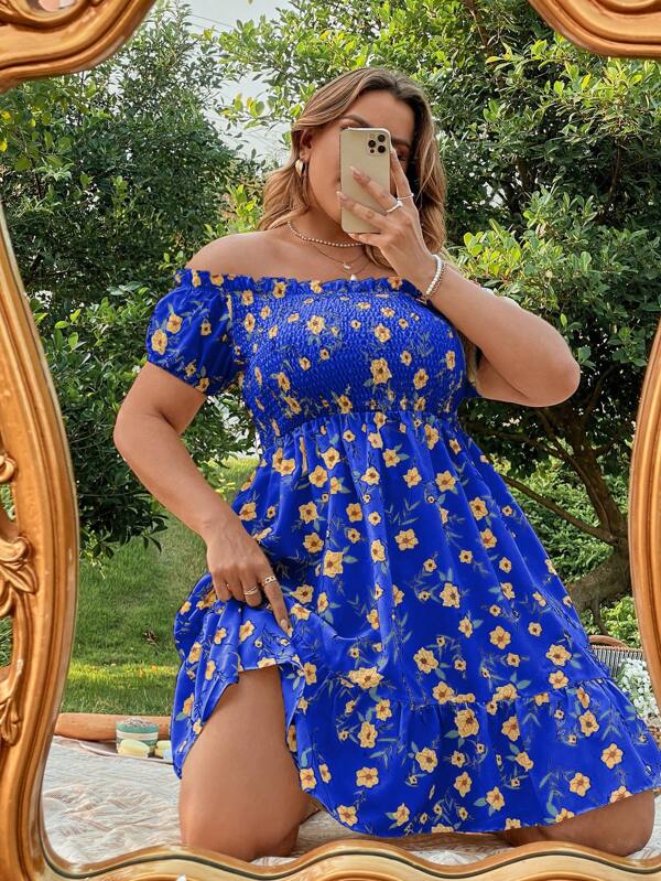 SHEIN WYWH Plus Floral Print Off Shoulder Ruffle Hem Dress