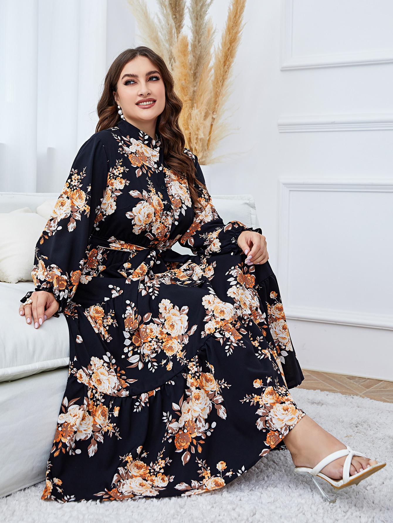 SHEIN Modely Plus Floral Print Ruffle Hem Belted Dress