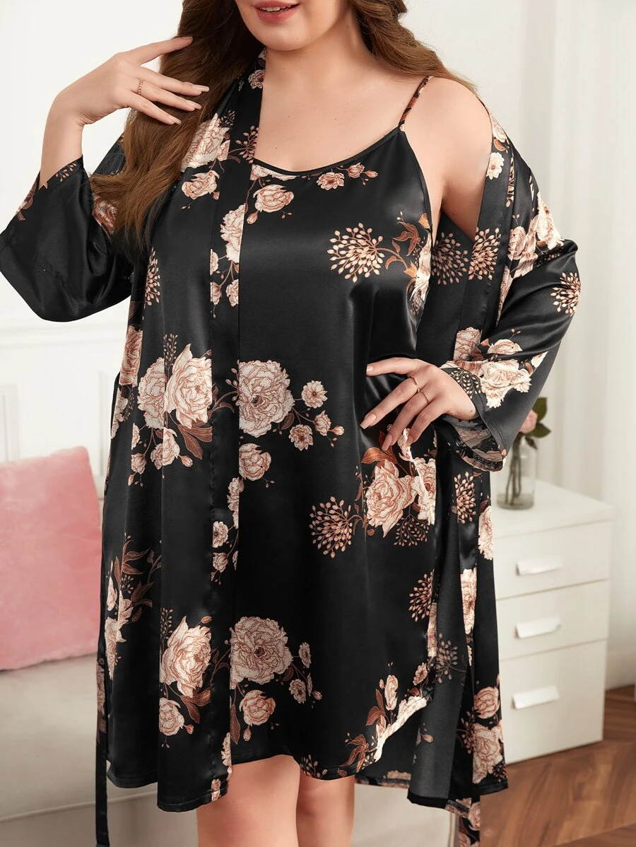 Plus Floral Print Satin Cami Nightdress & Belted Robe