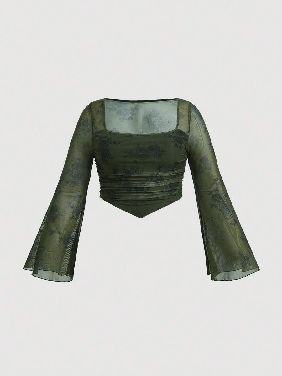 SHEIN MOD Plus Floral Print Square Neck Flare Sleeve Hanky Hem Ruched Tee