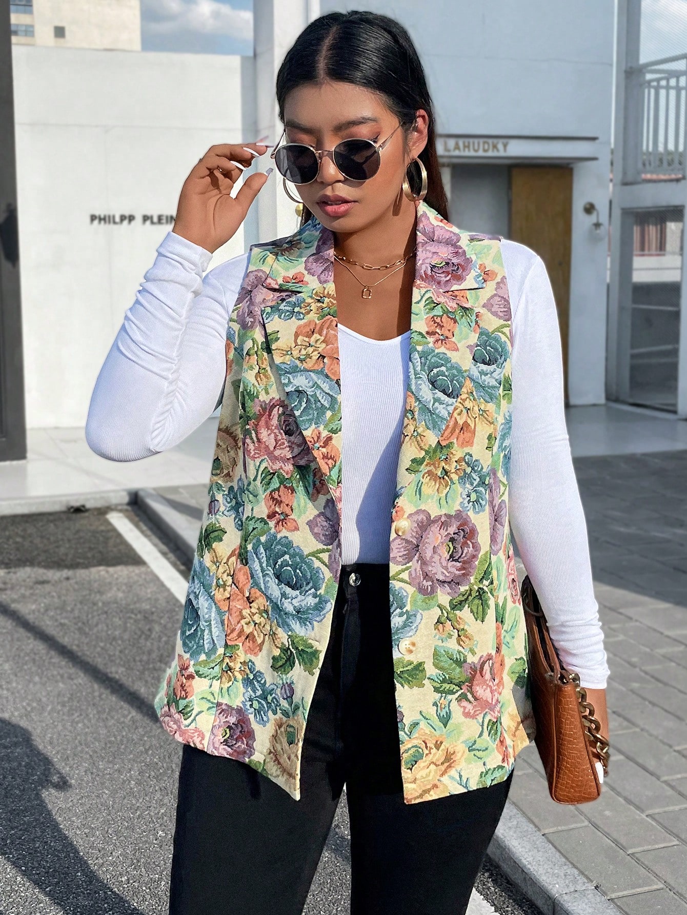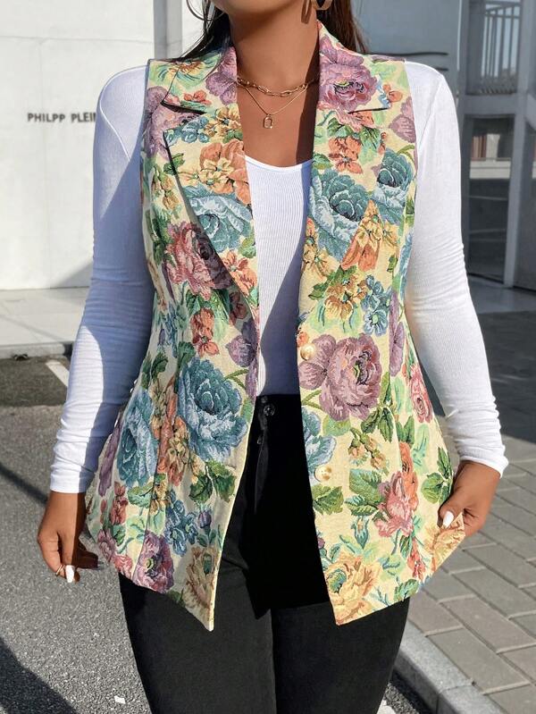 SHEIN Essnce Plus Floral Print Vest Blazer