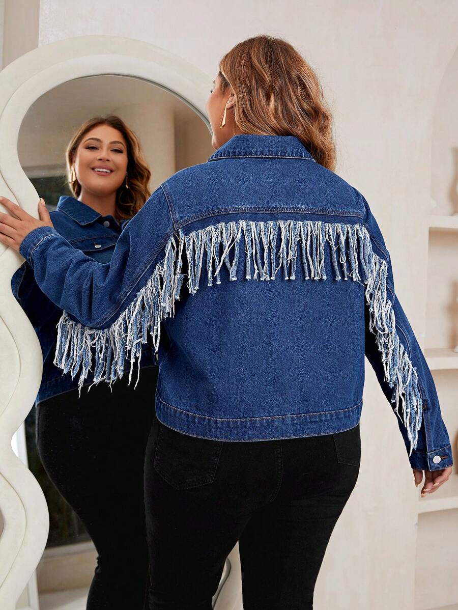 SHEIN LUNE Plus Fringe Trim Button Front Denim Jacket