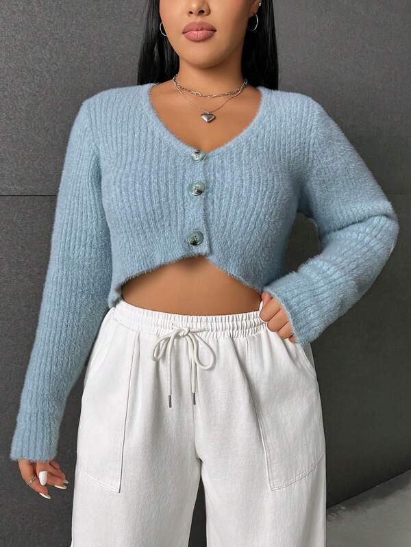 SHEIN EZwear Plus Fuzzy Ribbed Knit Crop Cardigan