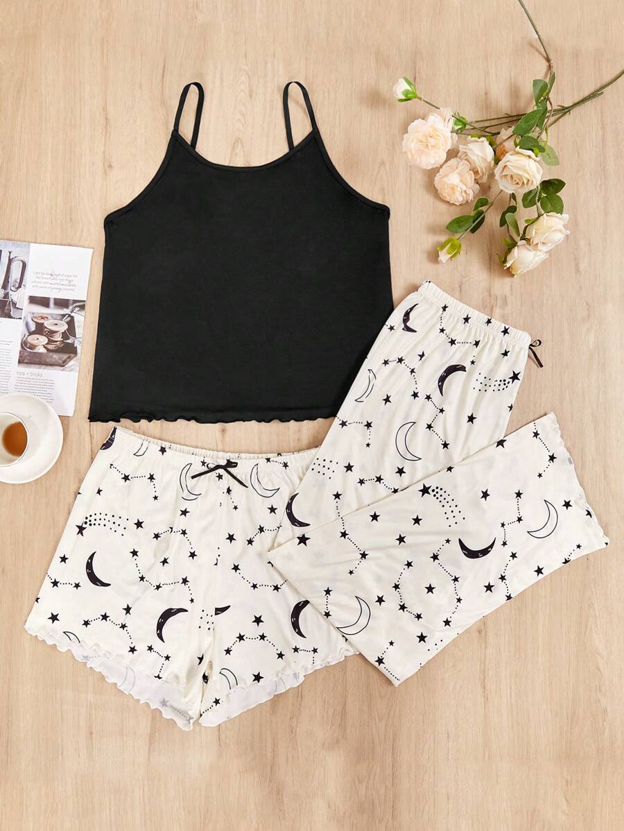 Plus Galaxy Print Cami Top & Shorts & Pants PJ Set